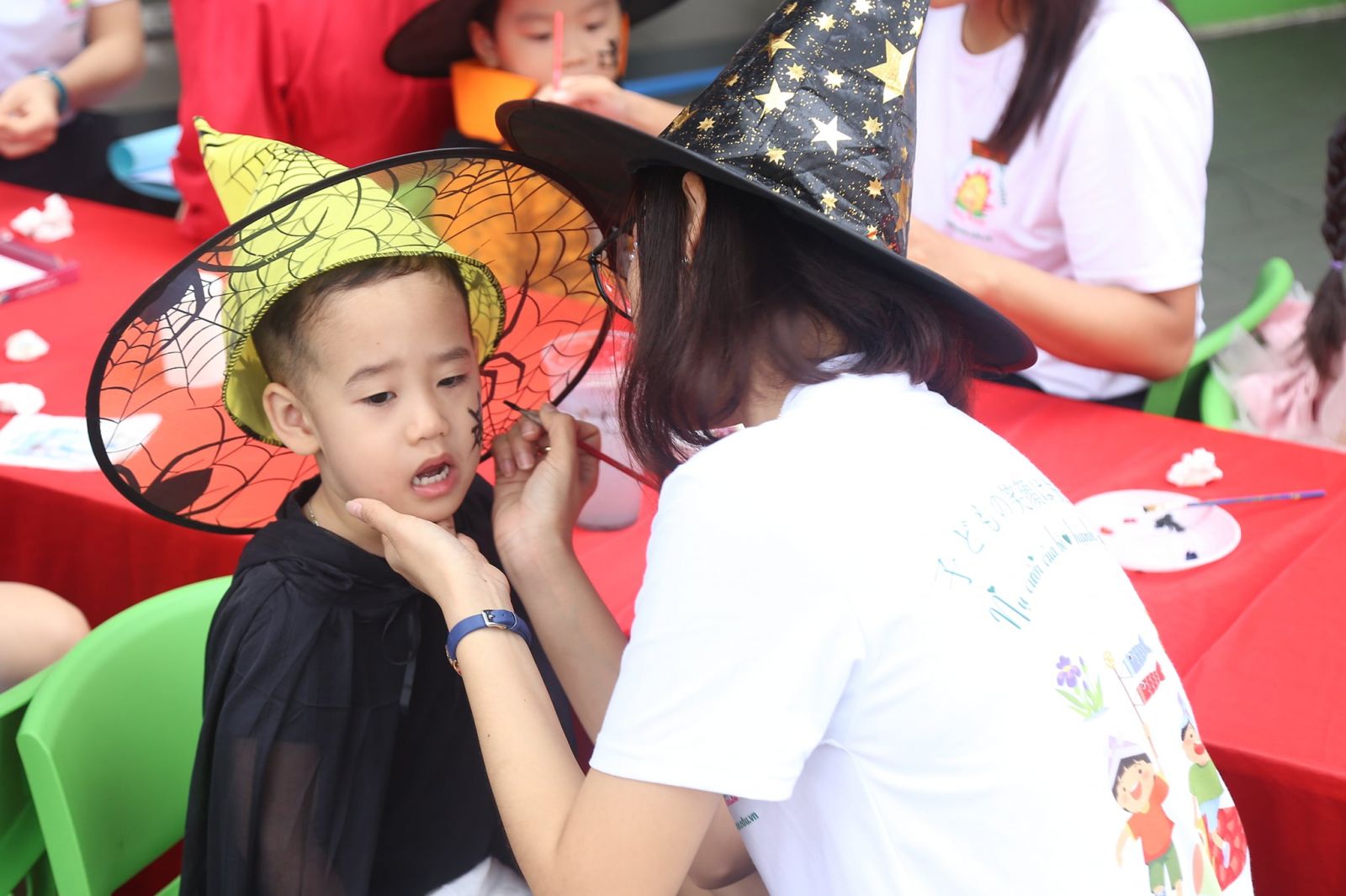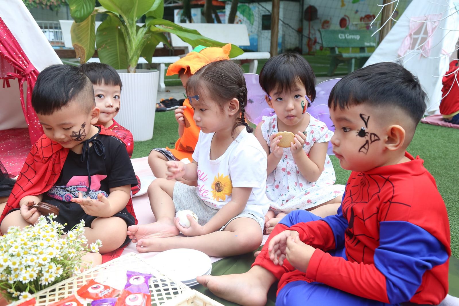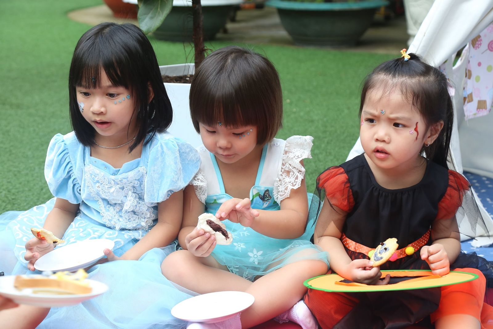 Các bé còn được các cô tô điểm thêm bằng những hình vẽ sặc sỡ, đậm chất hóa trang trên mặt, cùng nhau thưởng thức bữa tiệc buffet thật ngon với những chiếc bánh đủ hình hài lạ mắt.