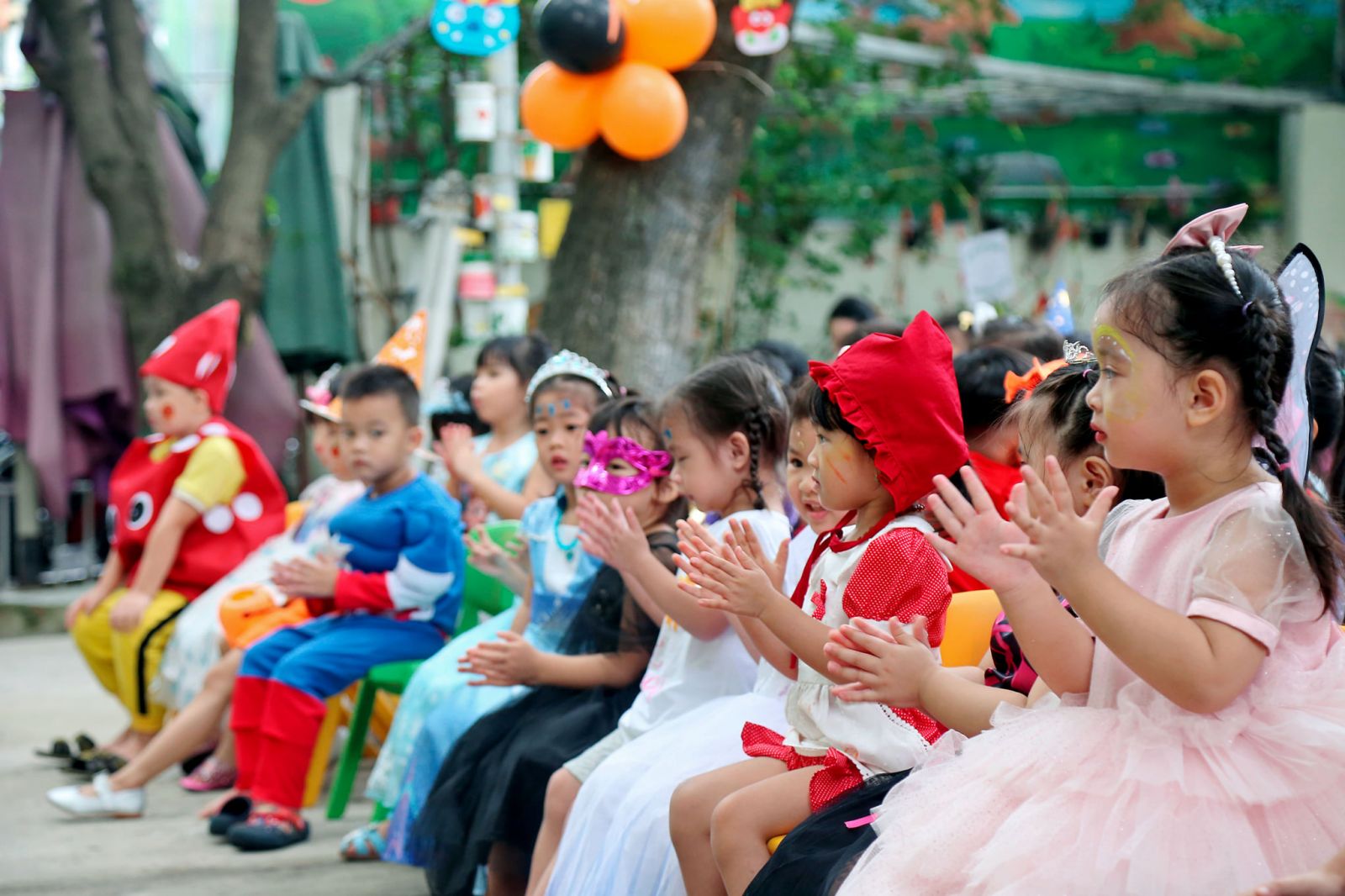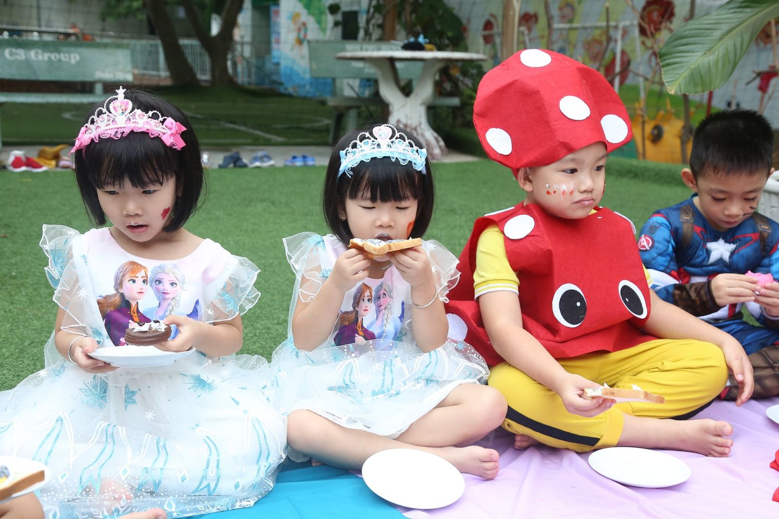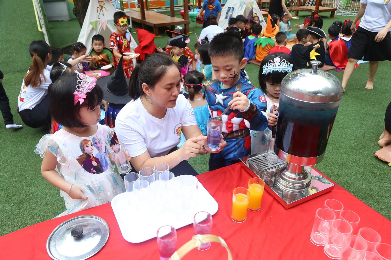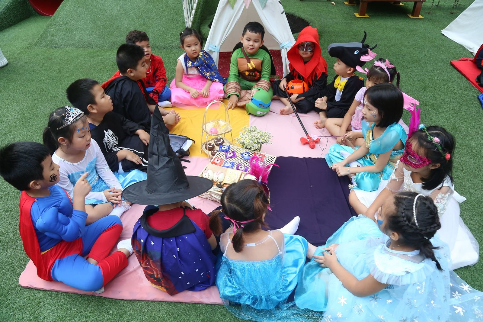 Các bé còn được các cô tô điểm thêm bằng những hình vẽ sặc sỡ, đậm chất hóa trang trên mặt, cùng nhau thưởng thức bữa tiệc buffet thật ngon với những chiếc bánh đủ hình hài lạ mắt.