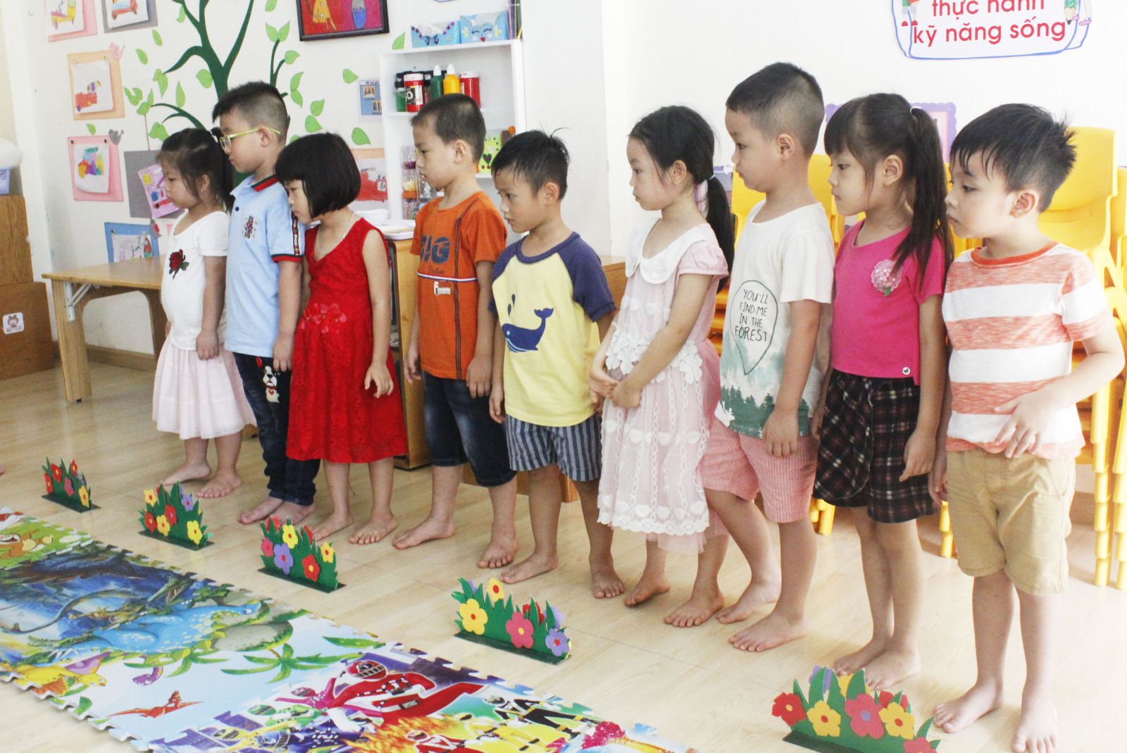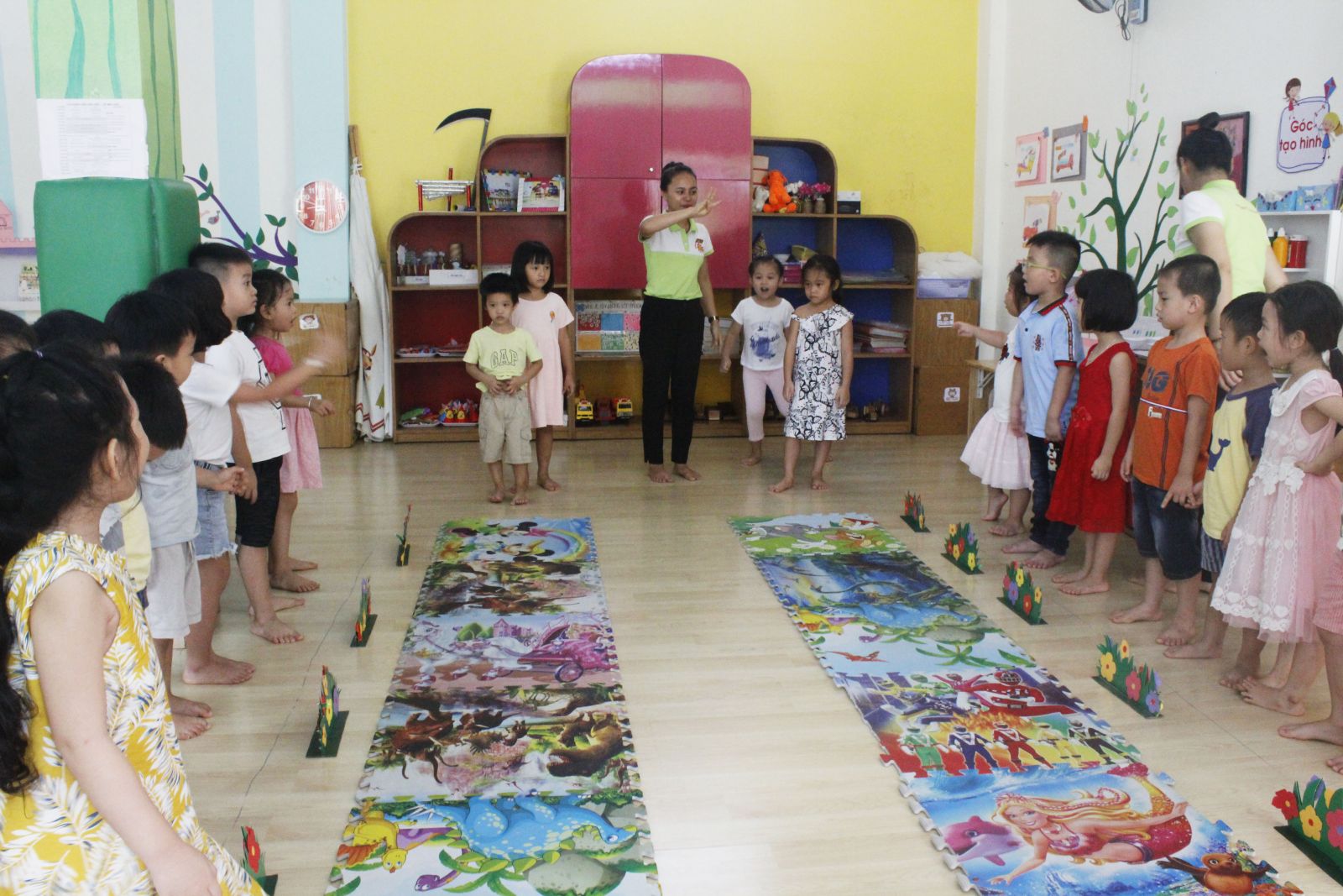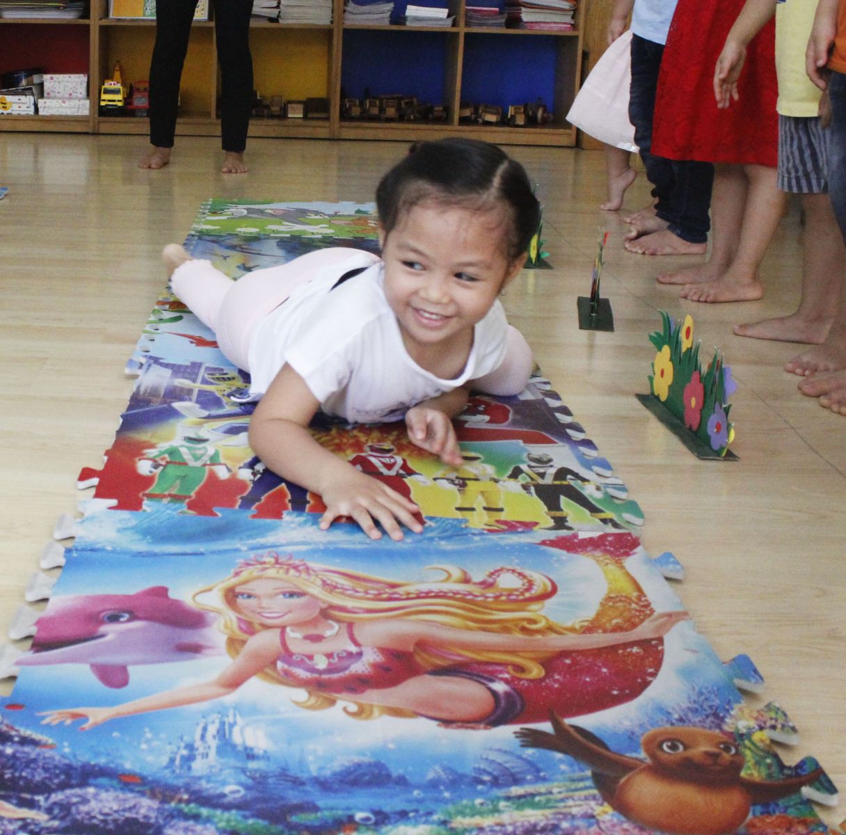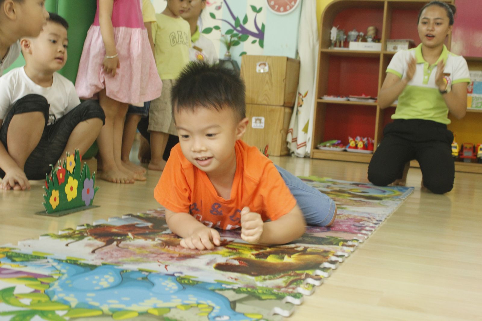 Trước khi bắt đầu thực hiện, cô hướng dẫn để các bạn hình dung lại và tập làm một chú cá sấu thật thụ. Cả lớp được phân làm 2 đội và lần lượt 2 bạn bước lên phía trước để hóa thân thành chú cá sấu tinh nghịch và đáng yêu. Không khí lớp Panda 1 trở nên sôi động và rộn ràng bởi những tiếng hò reo, cổ vũ của những bạn nhỏ. Khi vận động, có bạn bước đi cực kỳ giống, các bạn biết trườn sát người xuống thảm và phối hợp tay chân nhịp nhàng để trườn lên phía trước nhưng cũng có bạn trườn bò như chú rắn khiến cả lớp cười vang thật đáng yêu làm sao. Sau buổi học các bạn nhỏ nhận biết được đặc điểm của loài cá sấu cùng với vận động đặc trưng của chúng là trườn sấp.