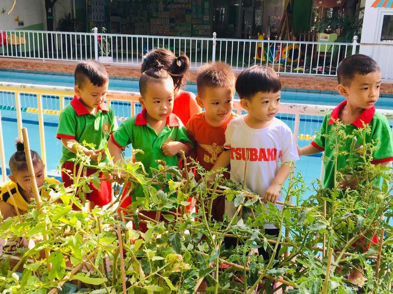 Trường bé có một vườn cây. Màu xanh tươi mát, thiệt là thích ghê. Ngày ngày các bé siêng năng. Thăm vườn, nhổ cỏ, tưới cây mát lành.Bé mong cây lớn mỗi ngày. Hoa thơm, quả ngọt từ tay bé trồng