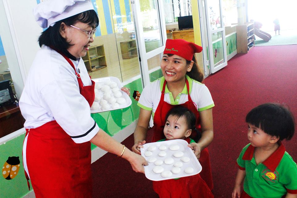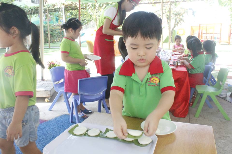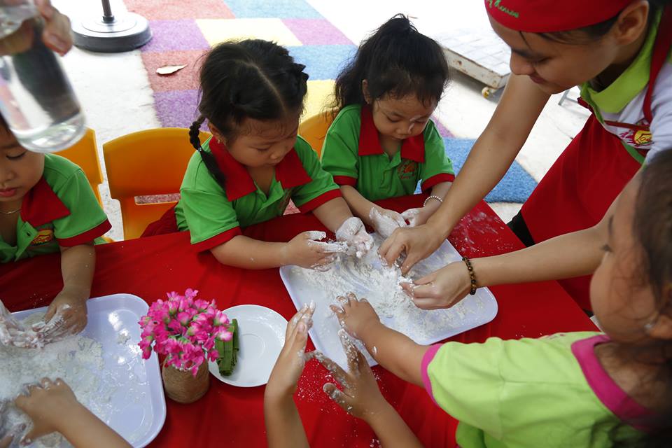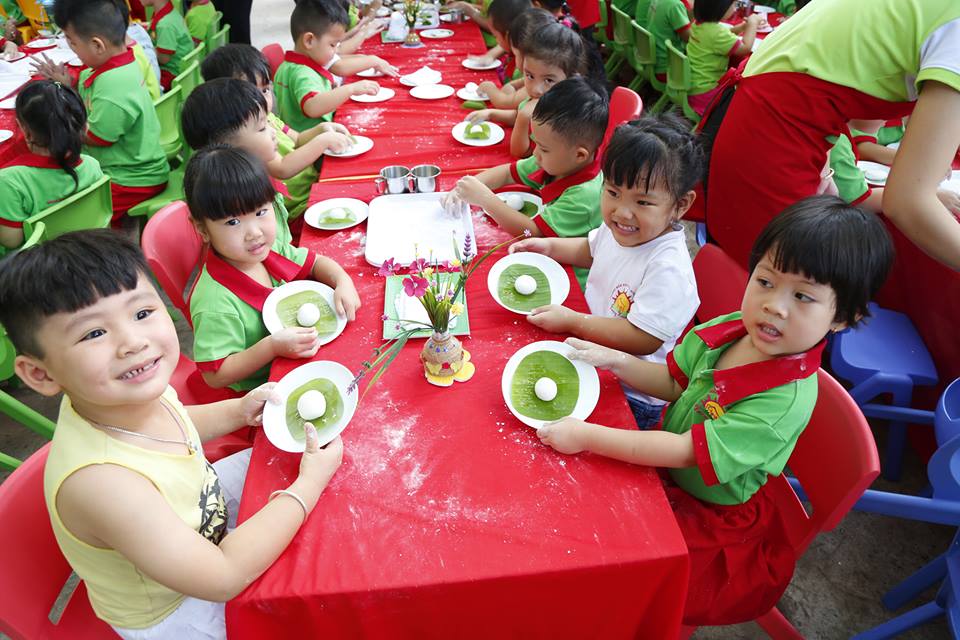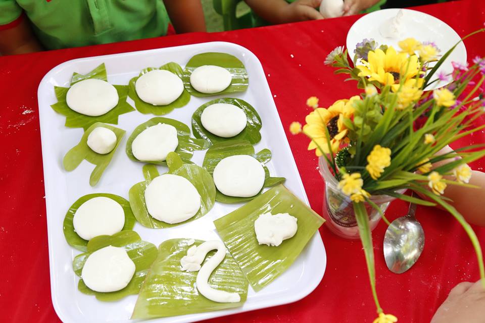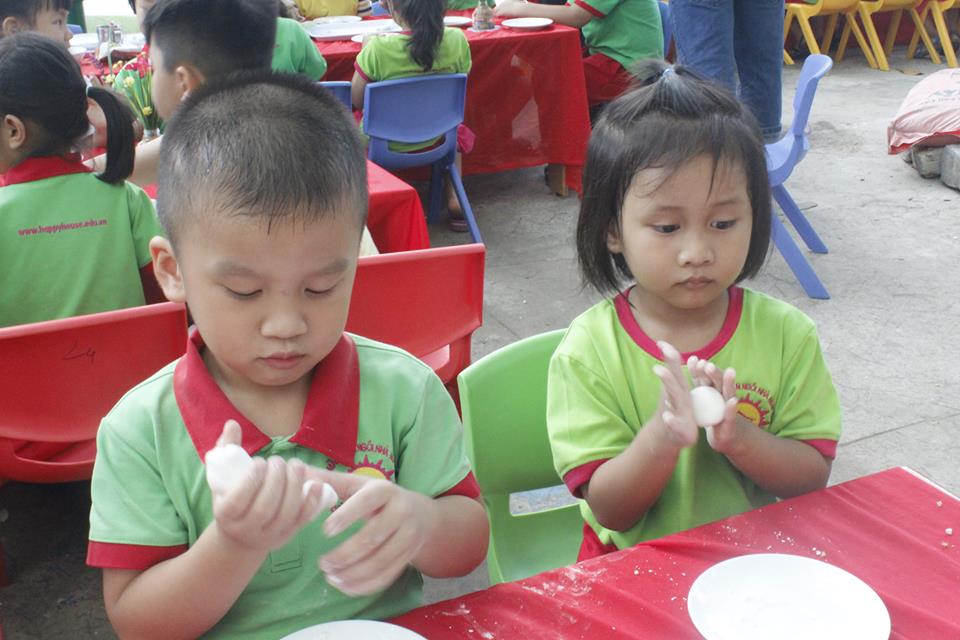 Tại đây, tất cả các bé từ Nhà trẻ đến Mẫu giáo đều được cô hướng dẫn, cùng nghe sự tích về bánh chưng và bánh giầy, từng bé bắt tay vào việc nhào và nặn bánh sau cho thành một hình tròn xinh xắn. Nhiều bé Khối Nhà trẻ cảm thấy vô cùng thích thú, tò mò vì loại bột cứ mềm mềm mà không hình dung bánh làm xong sẽ như thế nào. Sau khi làm xong, bột được đưa vào nồi để hấp chín. Sản phẩm hoàn thành, các bé được các cô gói thật cẩn thận và đẹp mắt để làm quà cho ba mẹ.
