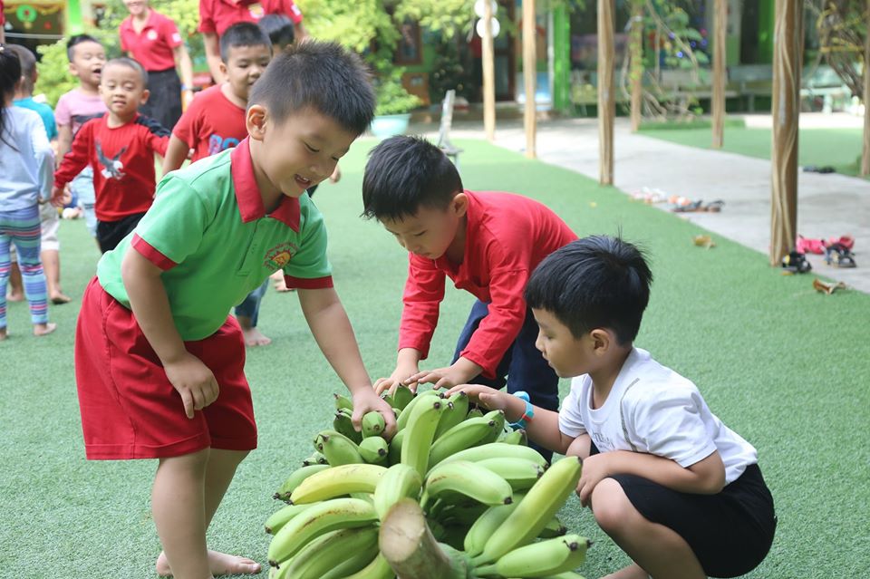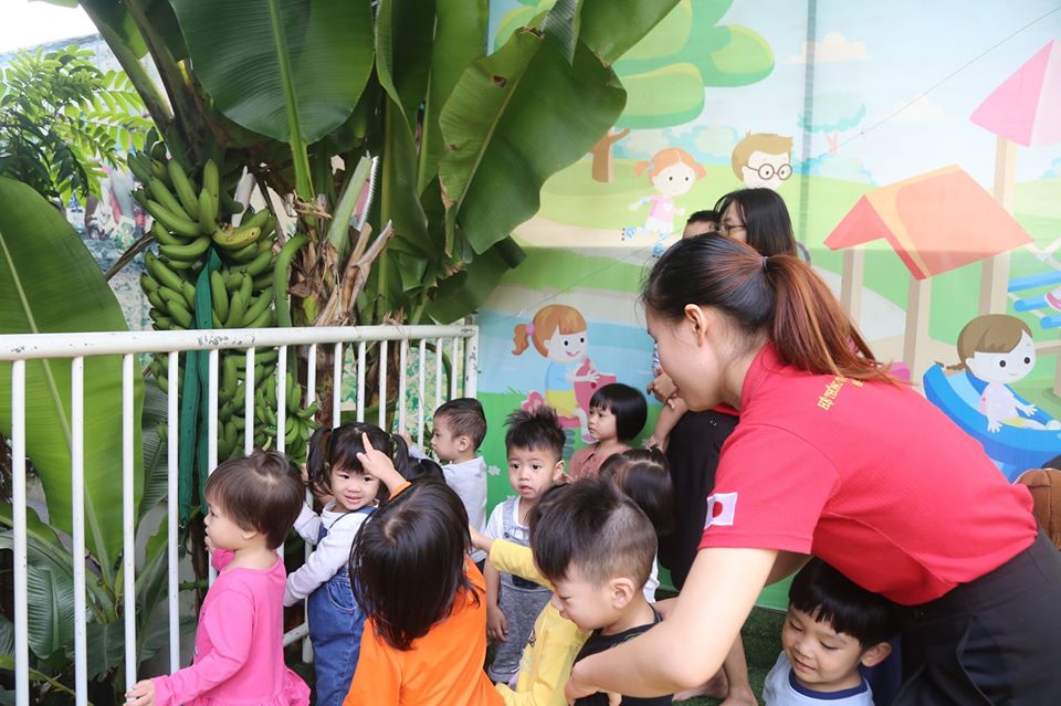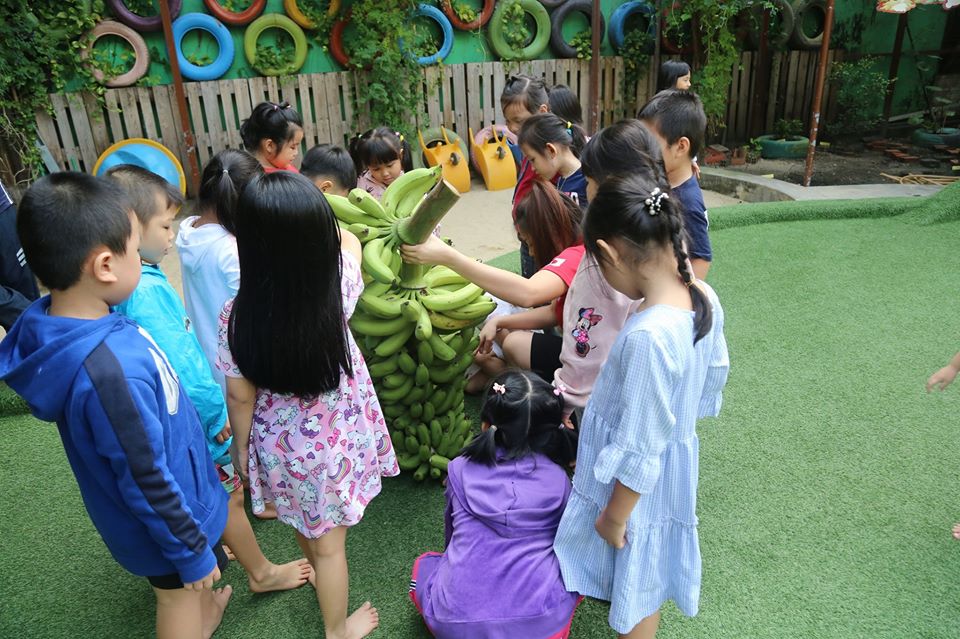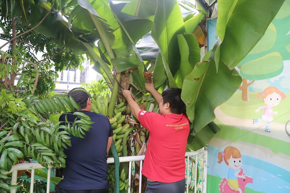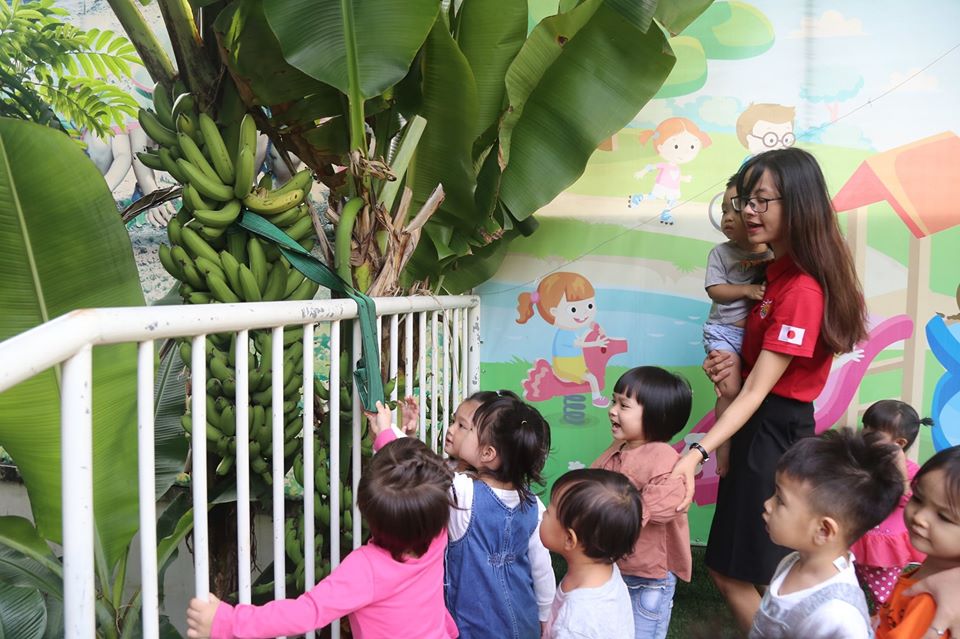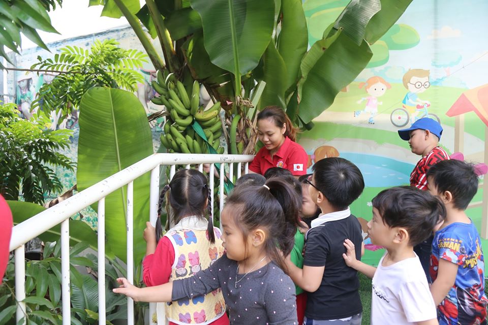 Bé thu hoạch vườn cây ăn trái ở sân trường Happy House