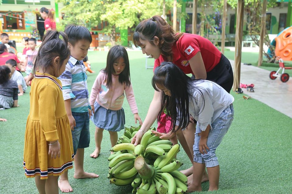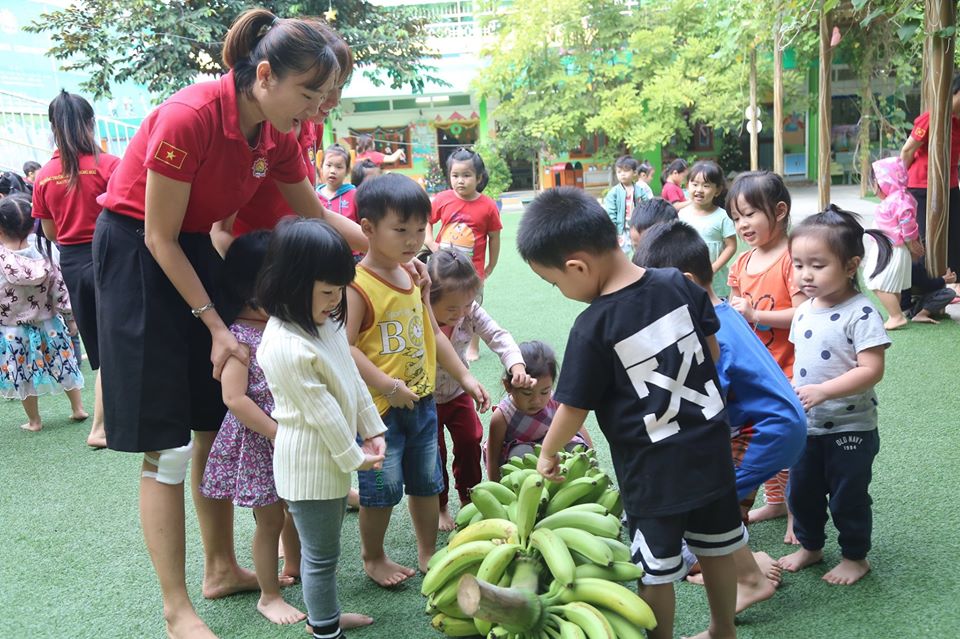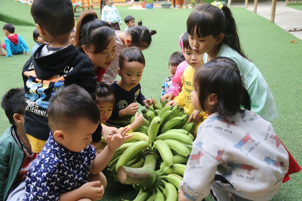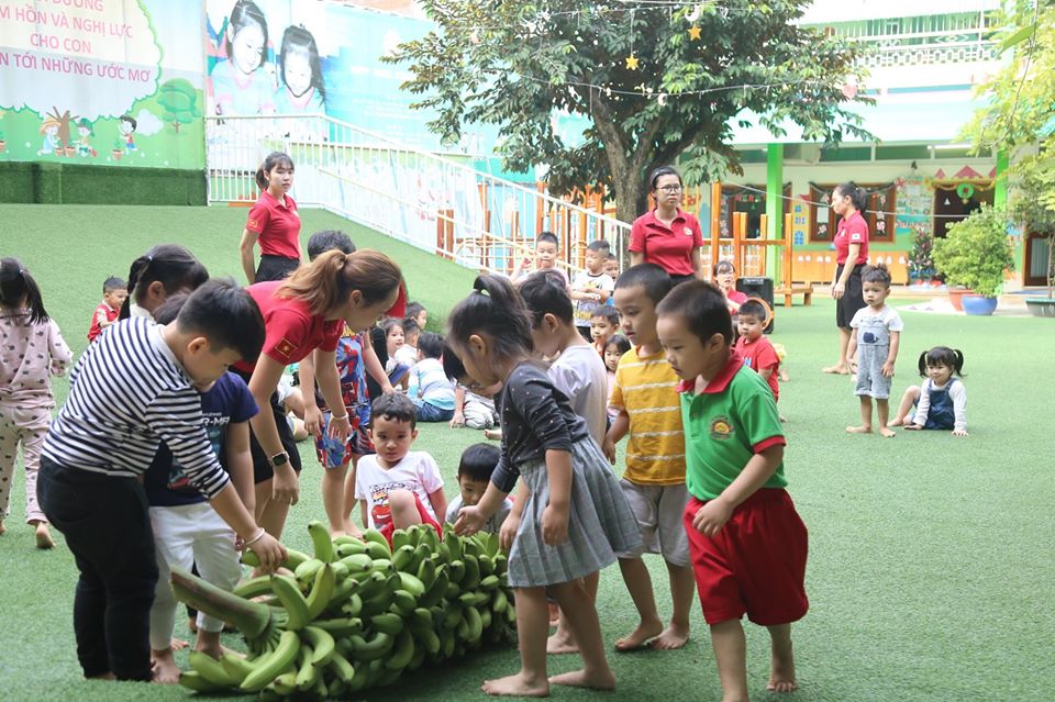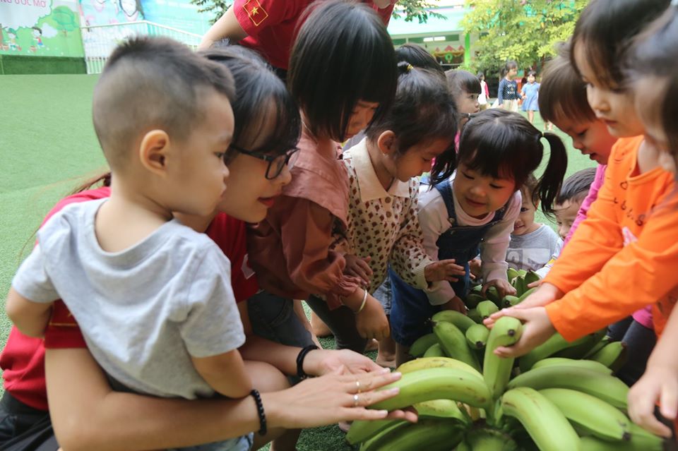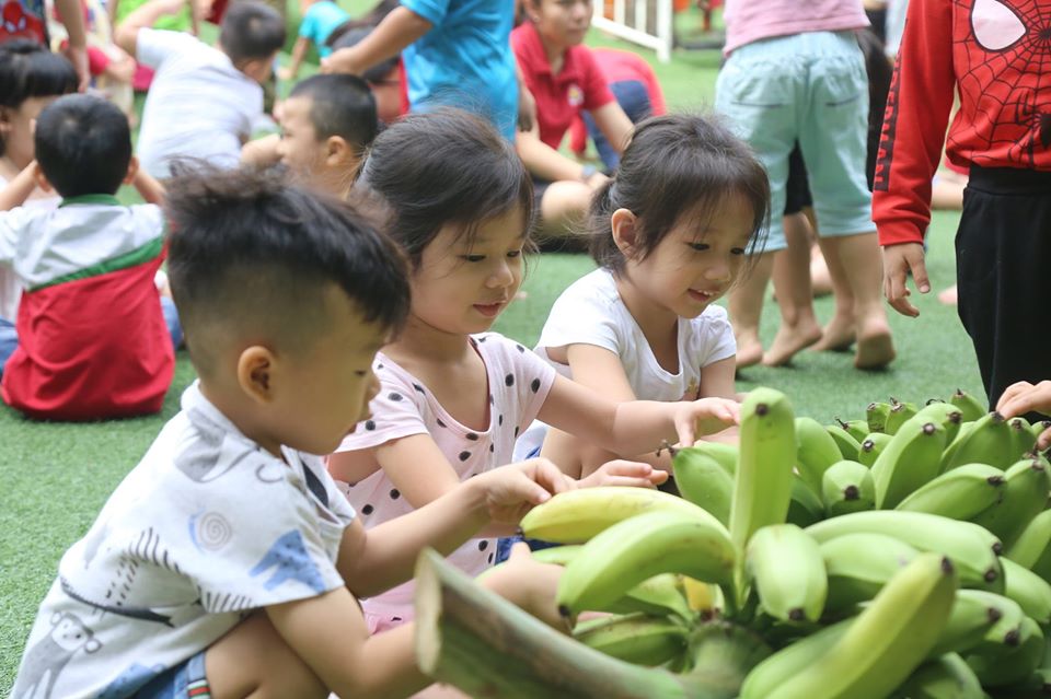 Bé thu hoạch vườn cây ăn trái ở sân trường Happy House