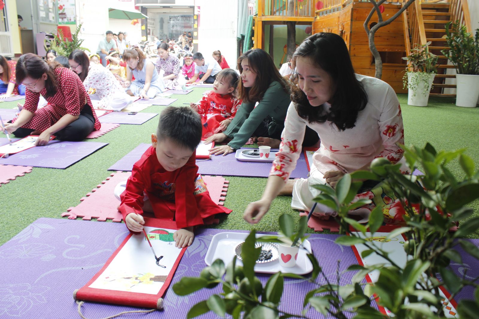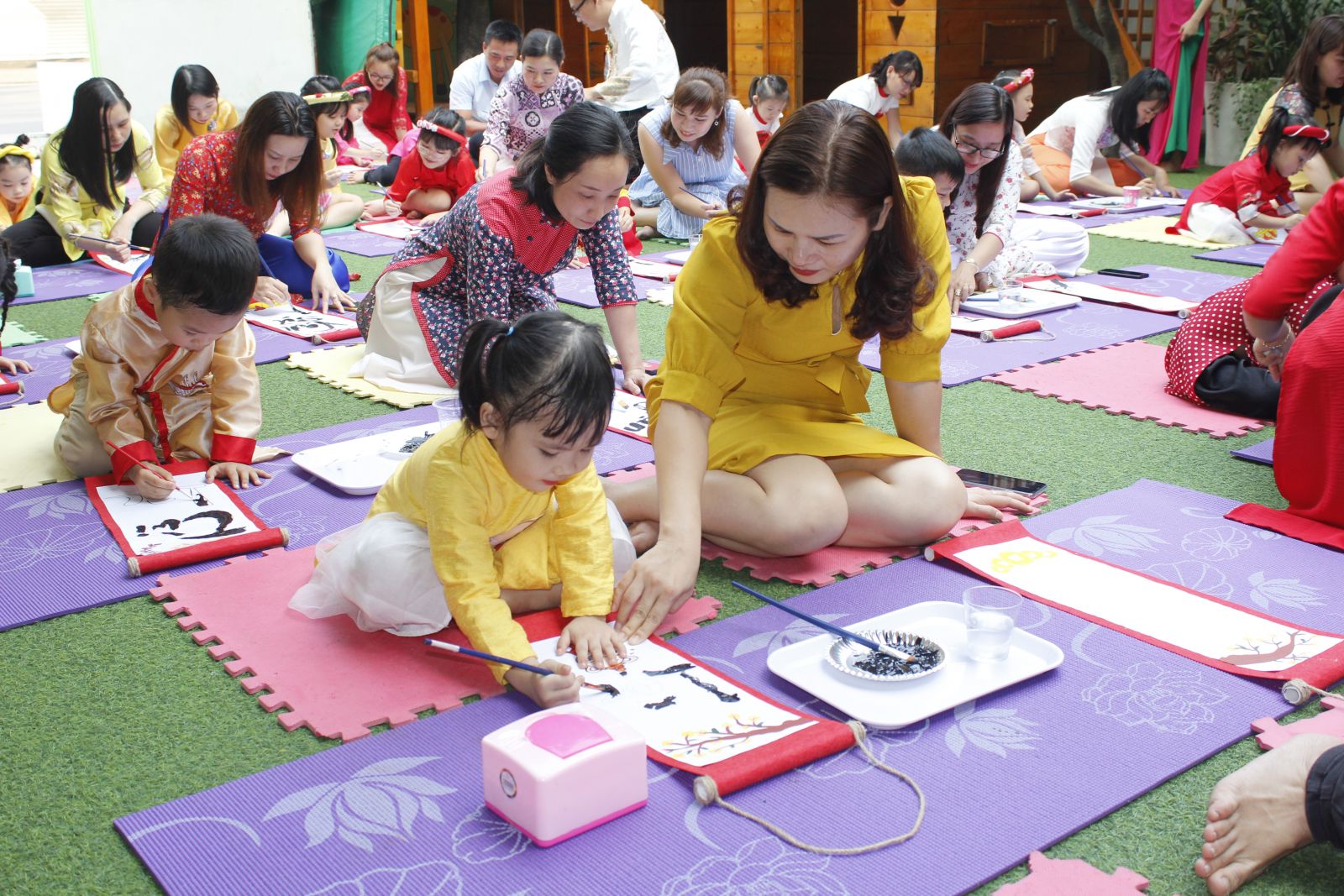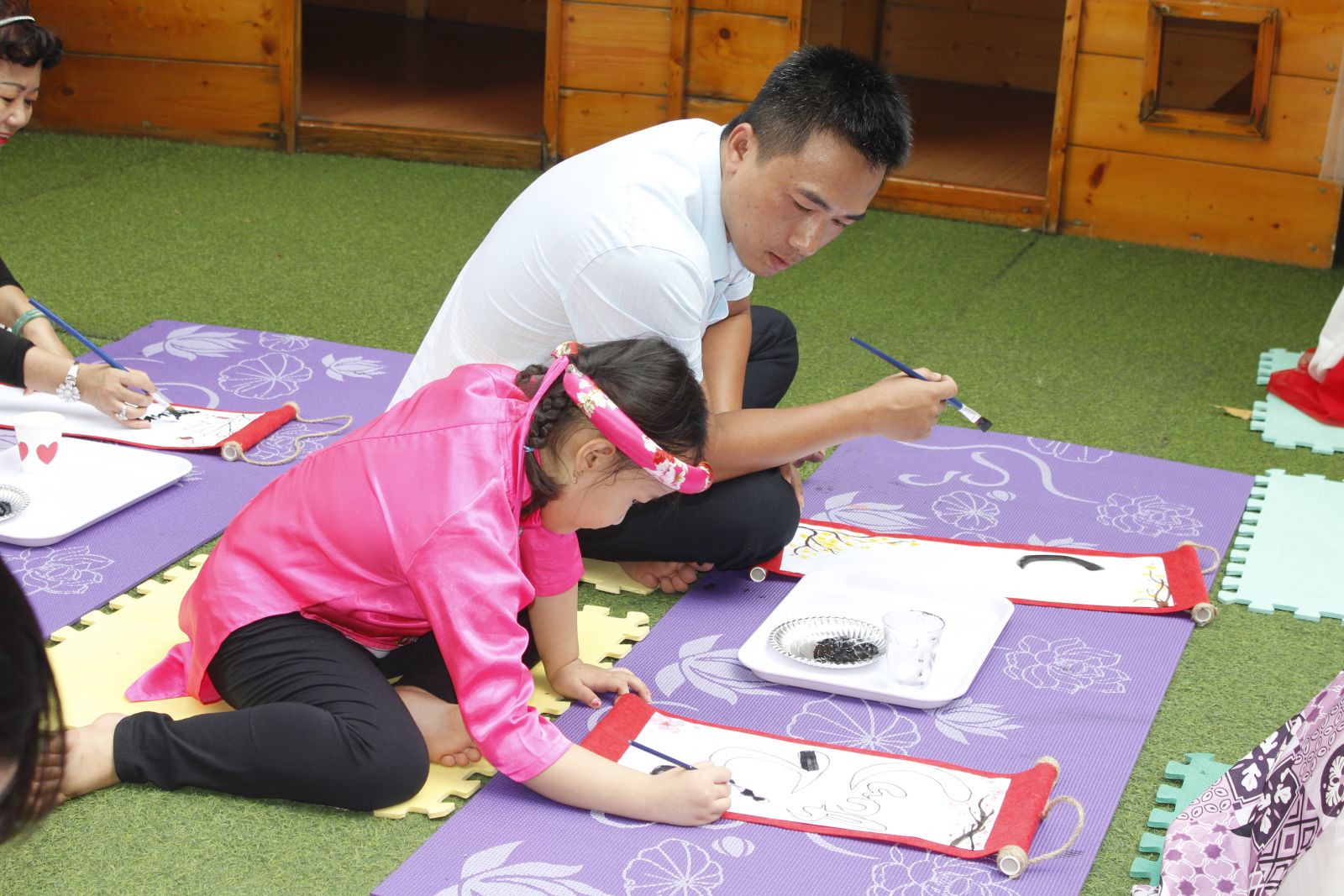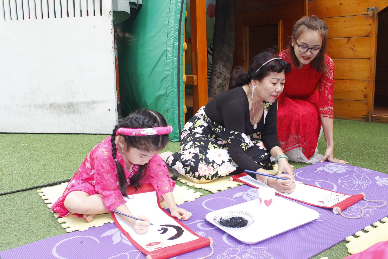 Bé và ba mẹ viết thư pháp cùng ông đồ