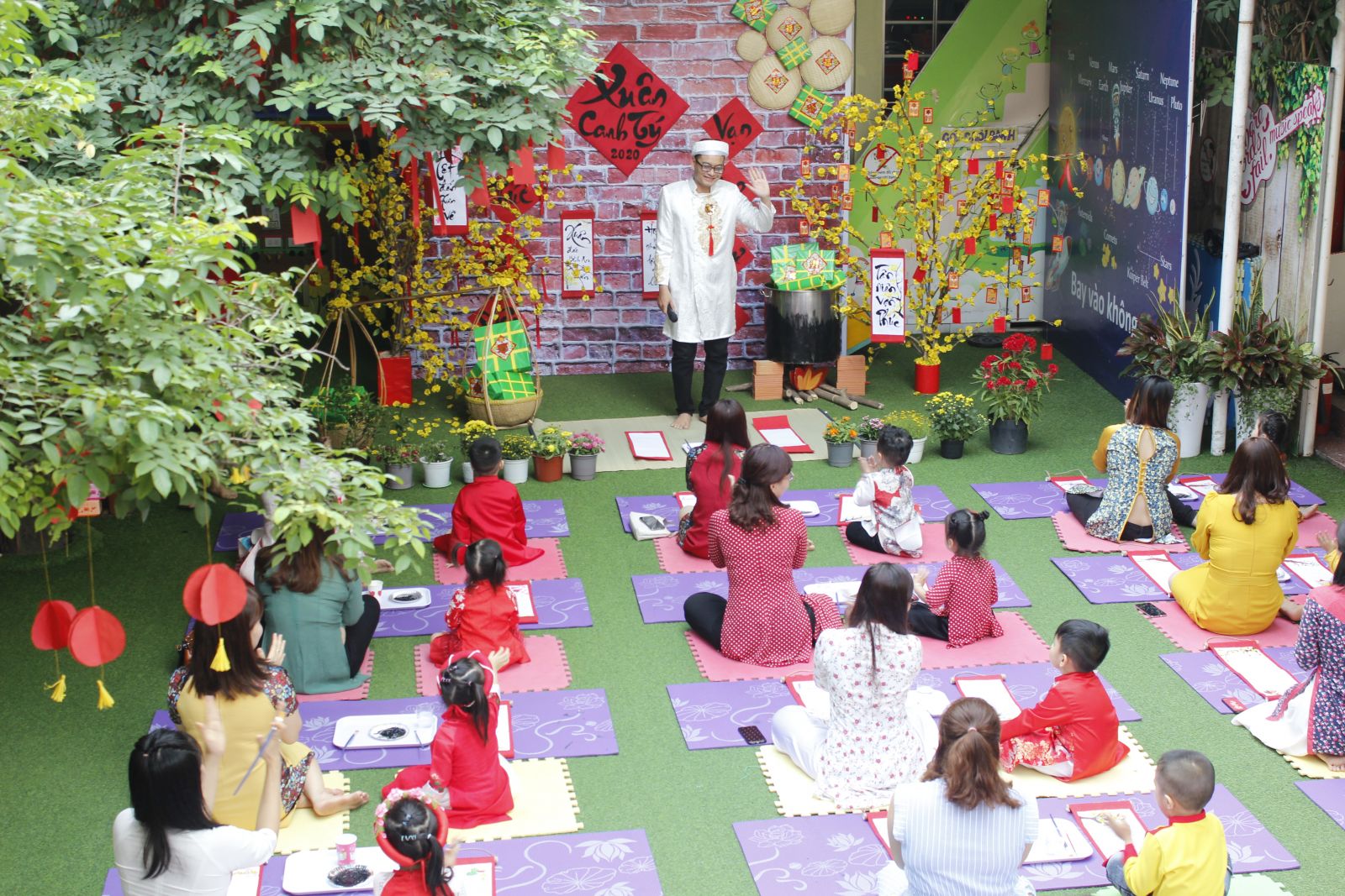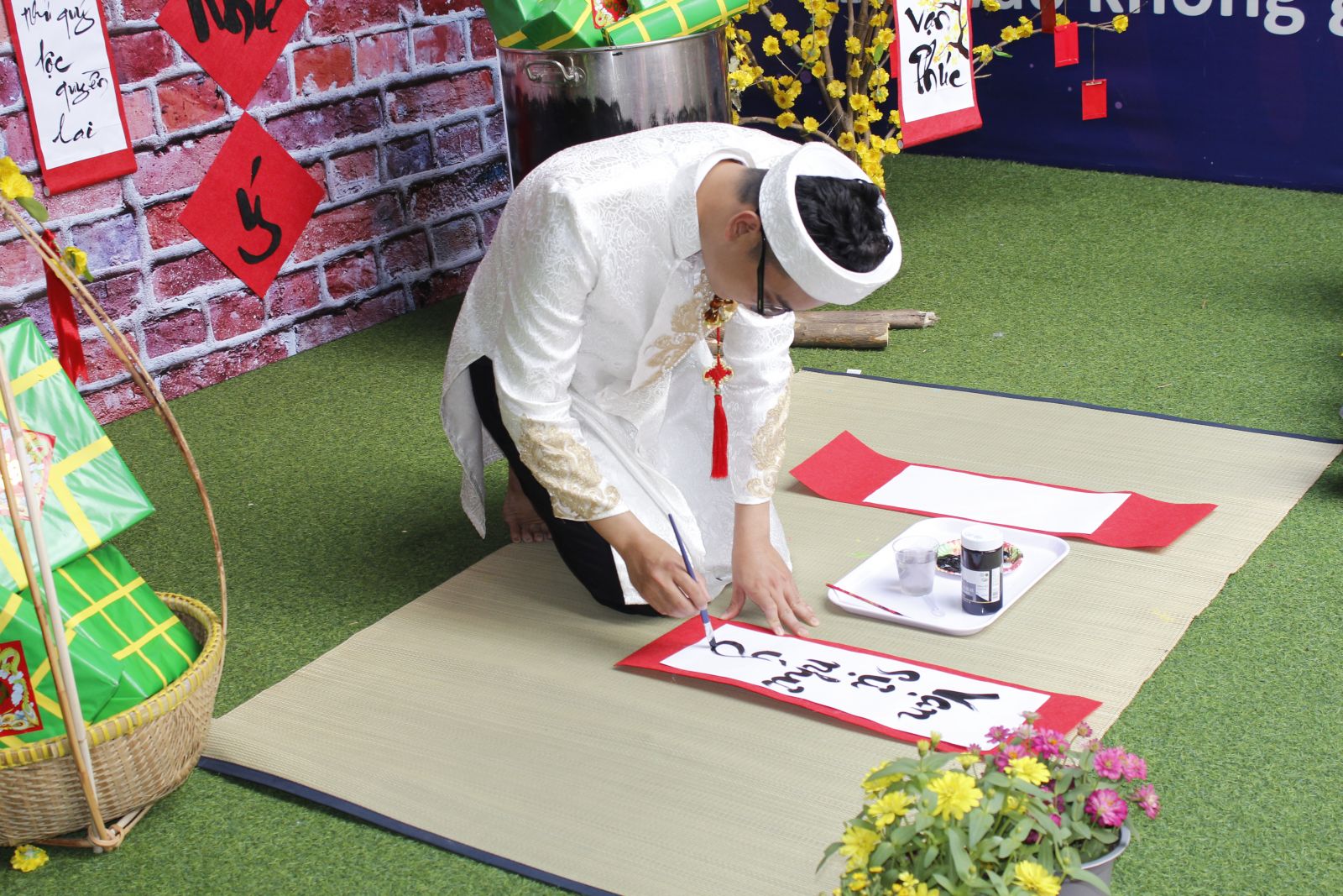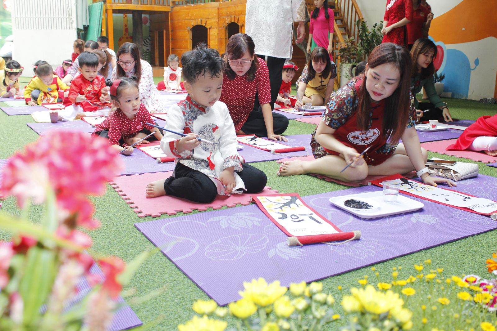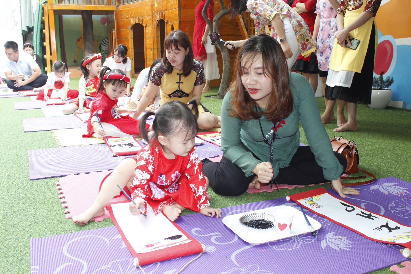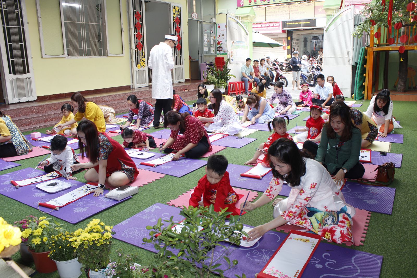 Bé và ba mẹ viết thư pháp cùng ông đồ