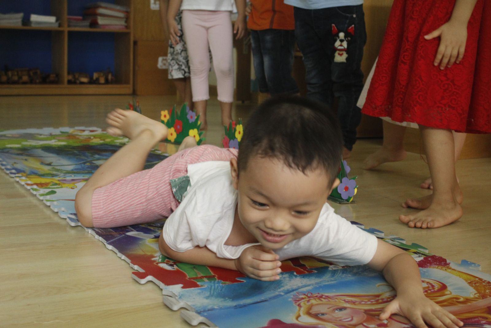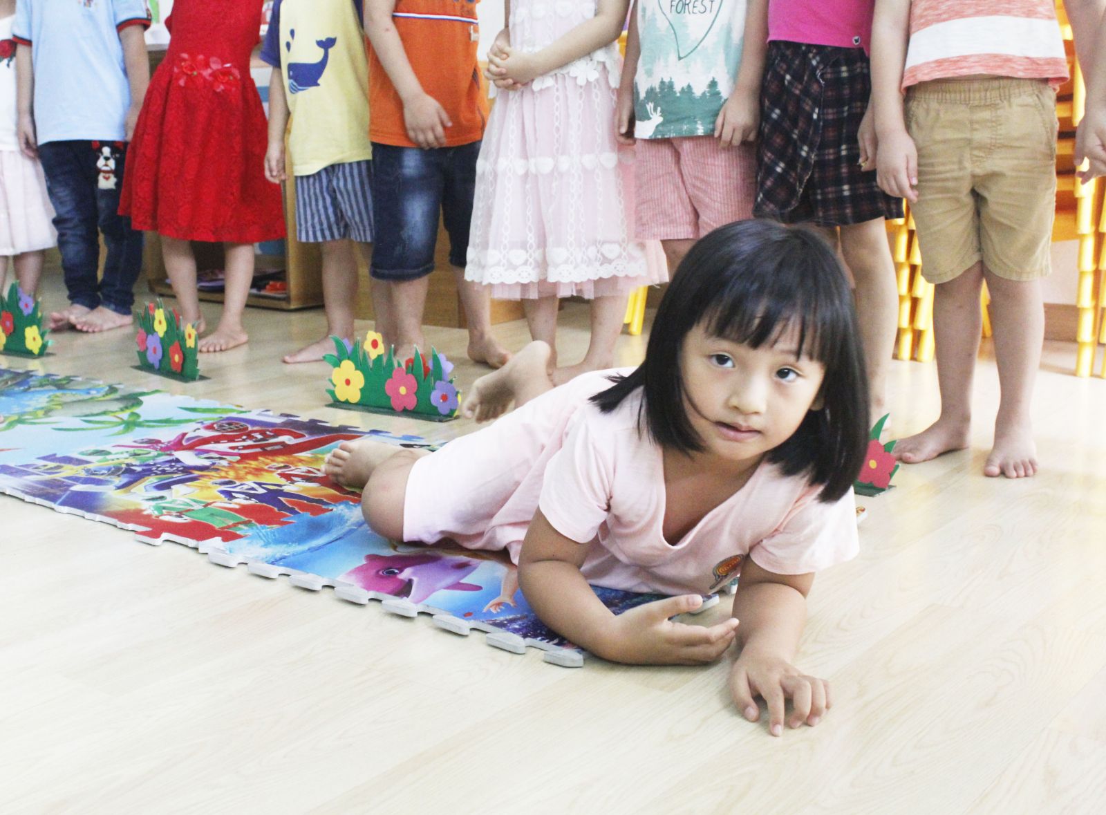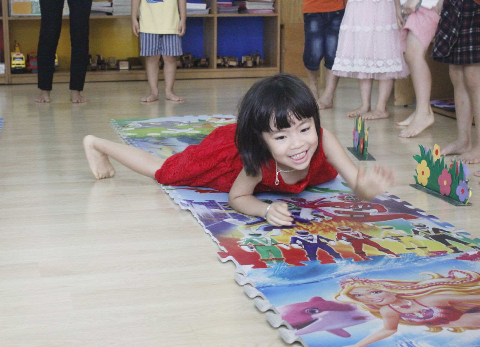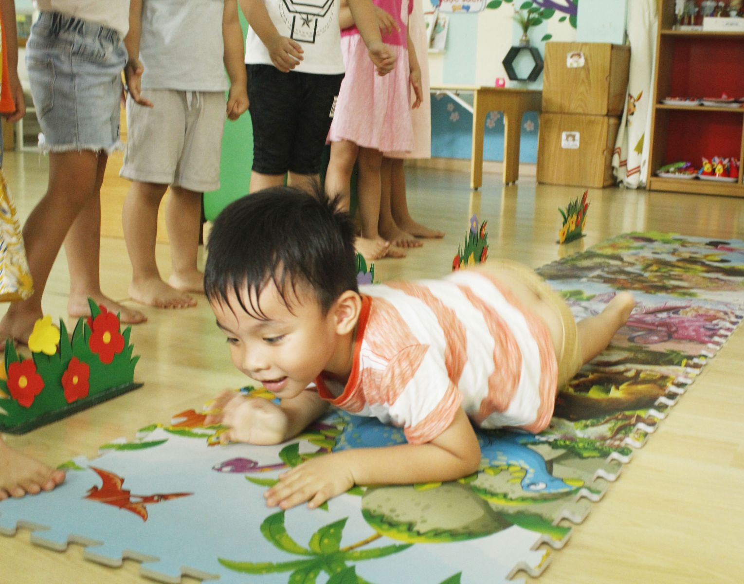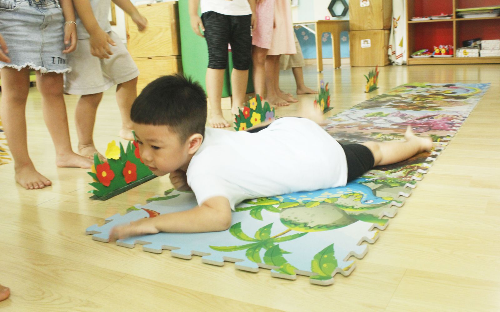 Trước khi bắt đầu thực hiện, cô hướng dẫn để các bạn hình dung lại và tập làm một chú cá sấu thật thụ. Cả lớp được phân làm 2 đội và lần lượt 2 bạn bước lên phía trước để hóa thân thành chú cá sấu tinh nghịch và đáng yêu. Không khí lớp Panda 1 trở nên sôi động và rộn ràng bởi những tiếng hò reo, cổ vũ của những bạn nhỏ. Khi vận động, có bạn bước đi cực kỳ giống, các bạn biết trườn sát người xuống thảm và phối hợp tay chân nhịp nhàng để trườn lên phía trước nhưng cũng có bạn trườn bò như chú rắn khiến cả lớp cười vang thật đáng yêu làm sao. Sau buổi học các bạn nhỏ nhận biết được đặc điểm của loài cá sấu cùng với vận động đặc trưng của chúng là trườn sấp.