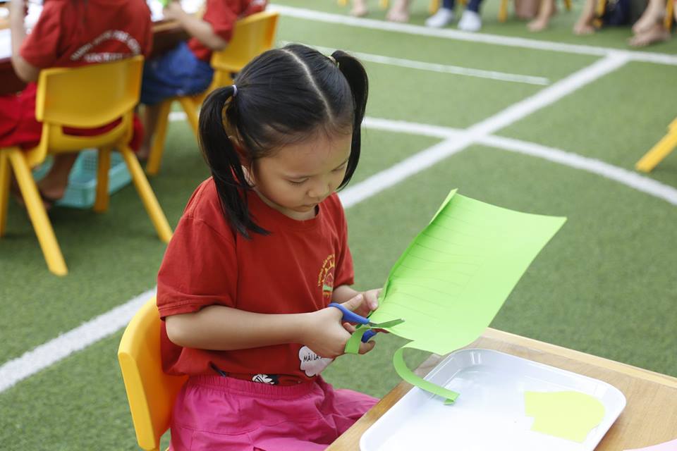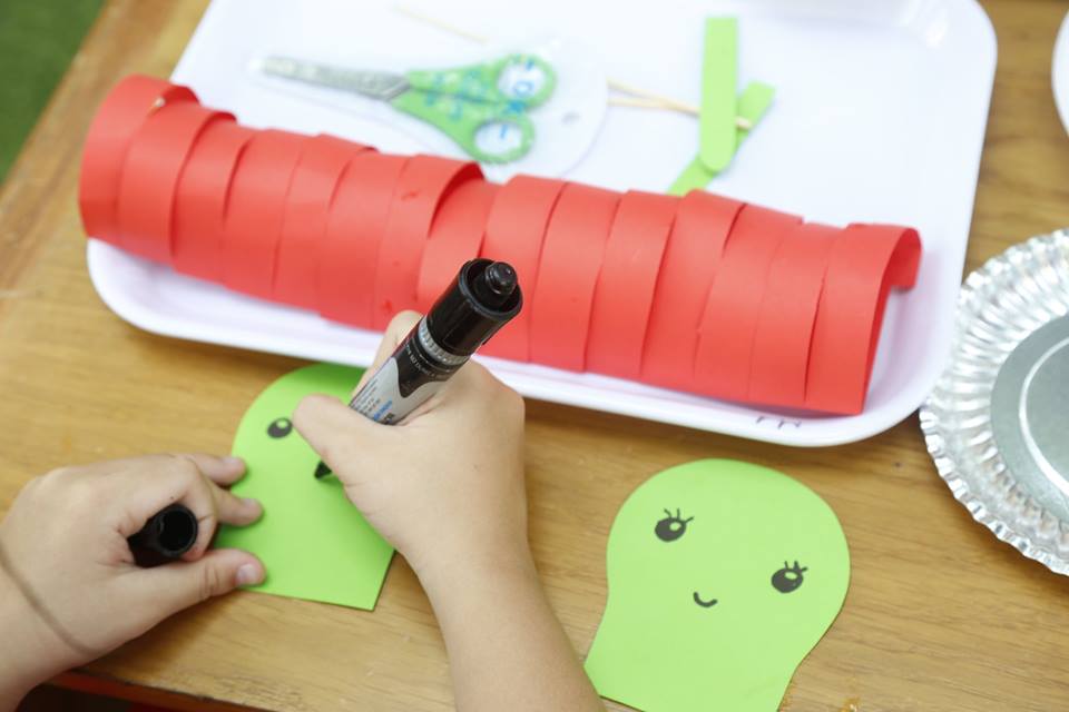 Nào, hãy cùng nhìn vào bảng hướng dẫn của cô giáo và bắt tay thực hiện nhé. Trước tiên là gấp và cắt giấy. Chà chà, nhìn vậy thôi chứ đây là một kỹ năng khá là khó đó nha!. Nhìn xem, bạn nào cũng rất chăm chú và tỉ mỉ để đường cắt thật đẹp, thật chính xác, đây là công đoạn để tạo hình cho thân của chú sâu đó nhé. Tiếp theo là dịp để các bạn trổ tài vẽ mắt, miệng của chú sâu. Bé thích chú sâu tâm trạng như thế nào thì sẽ vẽ như thế ấy. Sau khi xong phần khuôn mặt ngộ nghĩnh của chú sâu rồi thì mình cùng lắp chân và cho chú ấy nhé. Với đôi chân này, các bạn đã có một chú sâu ngộ nghĩnh, đáng yêu để có thể chơi đùa cùng các bạn rồi.