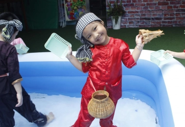 Nhìn những chiếc áo bà ba là thấy chính hiệu “nông dân nhí” luôn nha! Hôm nay, các “nông dân nhí” tại Happy House được trải nghiệm hoạt động thật mới lạ và hấp dẫn. Bé với các bạn cùng nhau đi bắt cá, những chú cá tung tăng bơi lội như vẫy gọi các bé vui đùa cùng mình. Có ai bị kích thích và thích thú như bé không nè. Ôi! thiệt là thích lắm cô ơi. Tuy một số bé rất mạnh dạn nhưng một số bé lại rất e ngại,... những hình ảnh đó thật đáng yêu và làm các cô cảm thấy hạnh phúc vì đã tạo cho bé một môi trường tuyệt vời để trải nghiệm và khám phá. Chúng ta cùng nhau lưu lại những kỉ niệm tuyệt vời và đáng nhớ này các bé nhé.