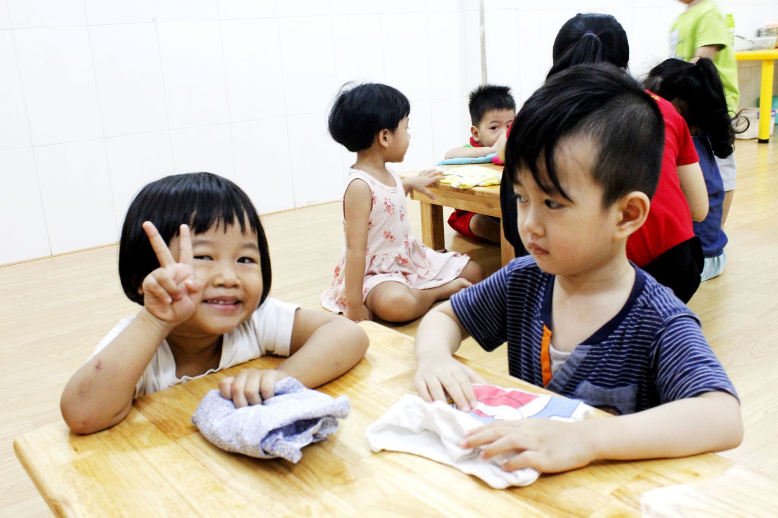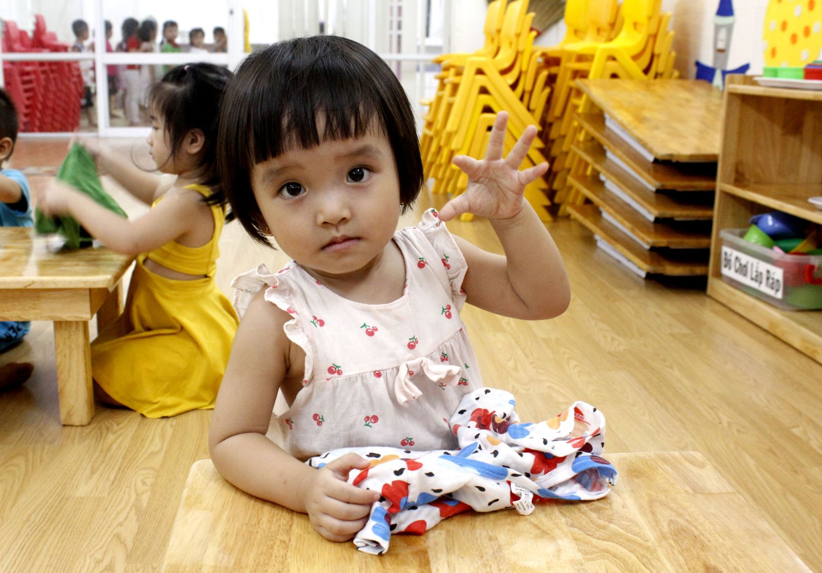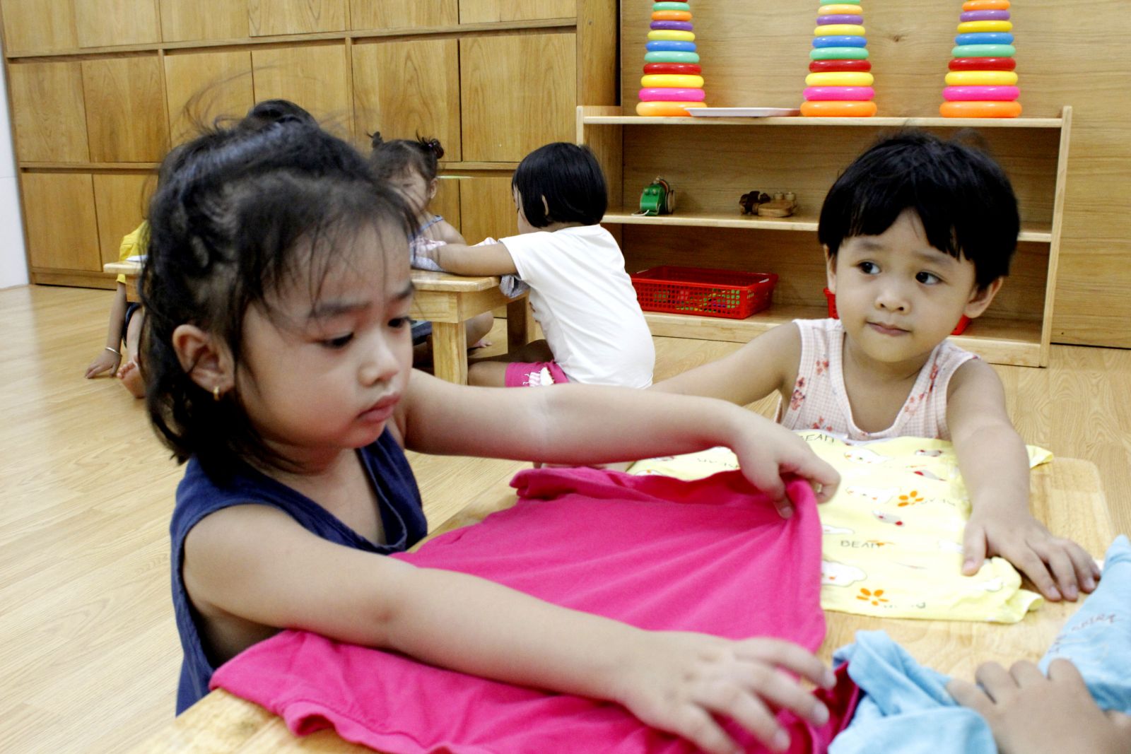 Các cô trường Mầm non Happy House - Vườn Lài đã khéo léo đưa kỹ năng gấp áo vào giờ học ngay tại lớp để tập cho bé tính kiên nhẫn, sự khéo léo, nhanh nhẹn, khả năng ghi nhớ và giáo dục để bé biết yêu thương, giúp đỡ ba mẹ những công việc nhà đơn giản.