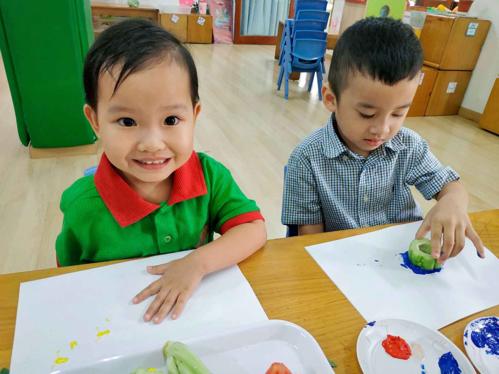 Hôm nay, các bé không phải tìm hiểu về các loại rau, mà là cùng nhau tạo nên bức tranh của riêng mình cũng từ rau củ và màu nước. Đó là bức tranh con dấu rau củ. Từ những lát cắt của rau củ đã tạo nên những hình dạng rất lạ, từ đó, các bé sẽ chấm màu nước, và sáng tạo nên bức tranh theo ý của mình. Những bức tranh trông thật đẹp và lạ mắt.