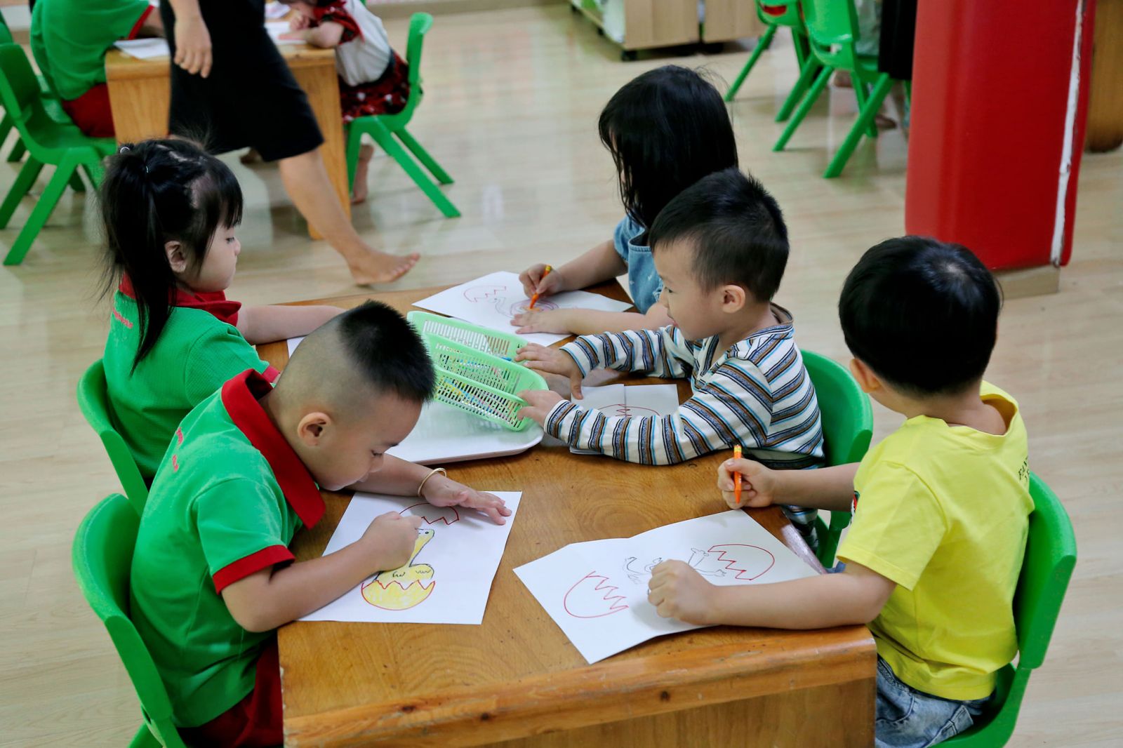 Hôm nay, các bạn được cô tạo sẵn cho một quả trứng, việc của các bạn là vẽ thêm con vật được sinh ra từ quả trứng của mình, có bạn thì thích khủng long, có bạn thì thích gà con, rắn con hay cả ngỗng con nữa, tất cả sự sáng tạo và sở thích của bé đều được tự do thể hiện qua những nét vẽ và màu sắc của mình.