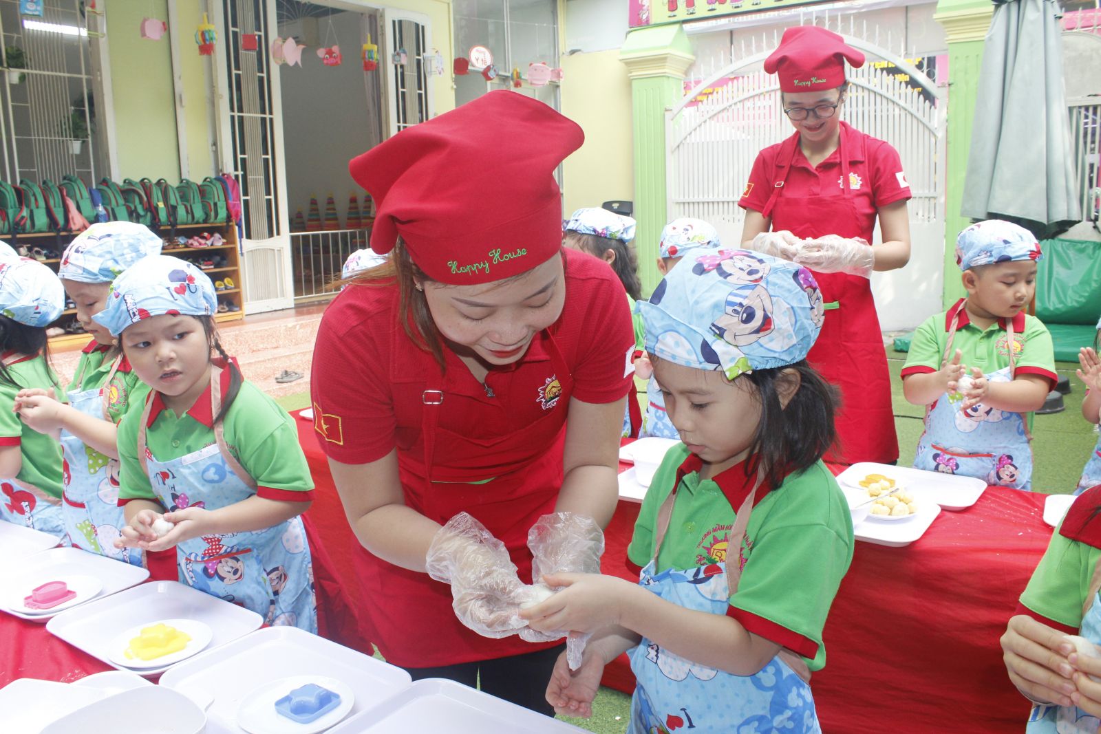 Những đôi bàn tay nhỏ xíu nhưng nhào nặn bột rất nhanh theo sự hướng dẫn của cô chiếc bánh hoàn thành rất nhanh chóng và đẹp mắt. Trong lúc hướng dẫn, cô kể cho bé nghe về ngày tết trung thu, tình cảm cô trò được kết nối từ các hoạt động như thế này. Cô trò chúng ta cùng gửi gắm tình yêu thương vào chiếc bánh nhé, cô luôn mong các bé của cô sẽ luôn vui và hạnh phúc.
