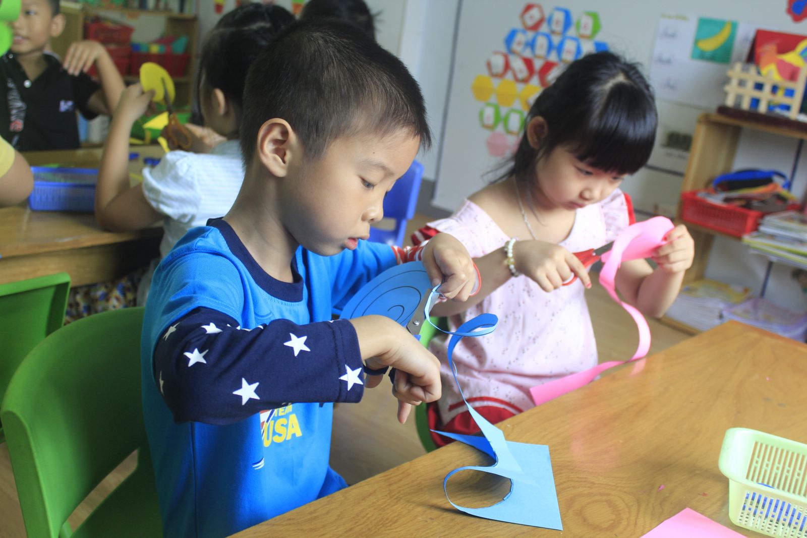 Con dùng kéo cắt giấy giúp phát triển thẩm mỹ cho trẻ mẫu giáo. Thông qua vận động cắt xoắc ốc trên giấy nhằm rèn sự khéo léo cho trẻ, luyện cho trẻ sự phối hợp tốt hơn của tay và mắt. Không những thế, hoạt động này còn giúp trí não con phát triển hơn vì phải sử dụng suy nghĩ để điều khiển đôi tay.